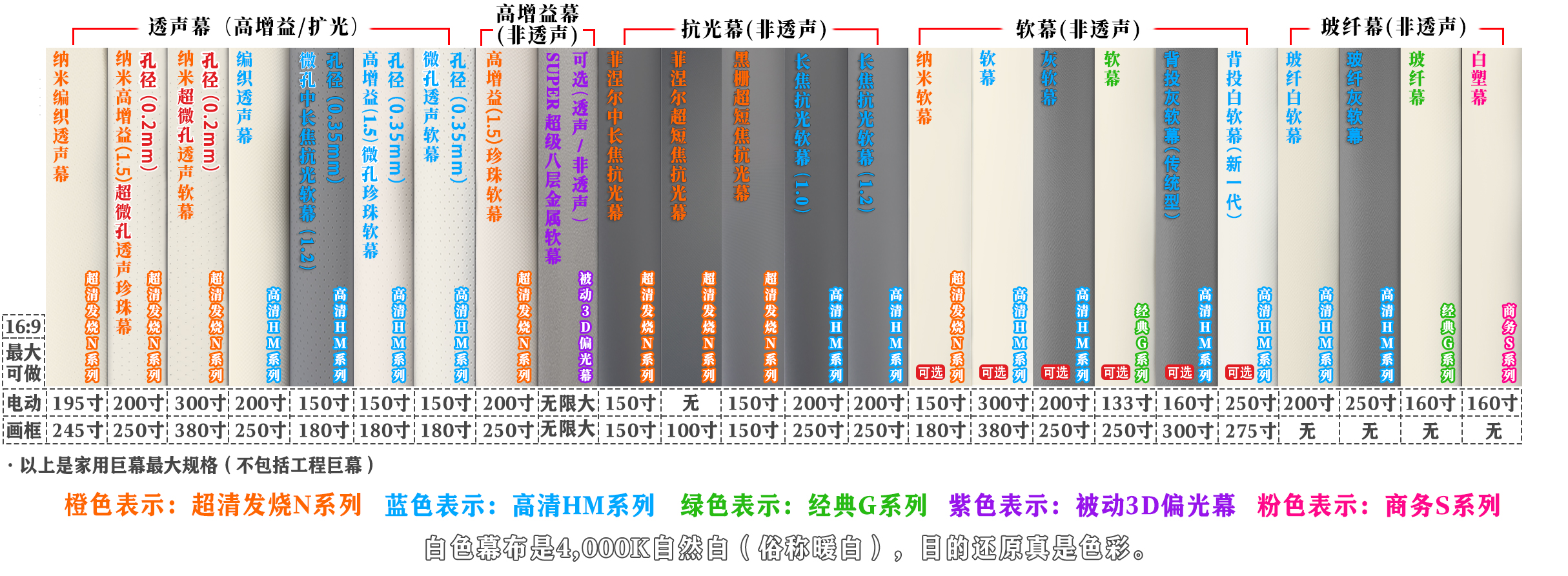 投影幕料 : 高清软幕/背投灰软幕/高清背投白软幕(详细见下方幕布样本图)