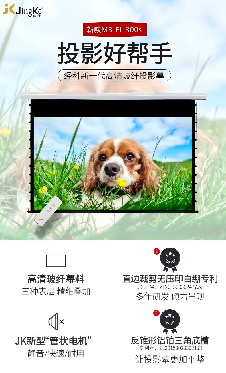 M3-FI/300s 新一代进口高清玻纤幕,采用玻璃纤维作底布取代传统白塑针织底布,玻璃纤维(简称玻纤)在寒冷及炎热天气有着平整作用,在显像方面以玻纤作为底层,使用高科技pvc面涂层画面更卓越。